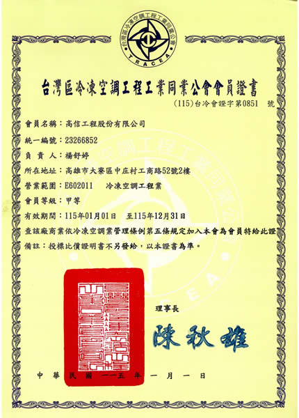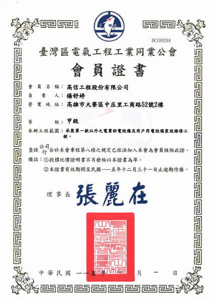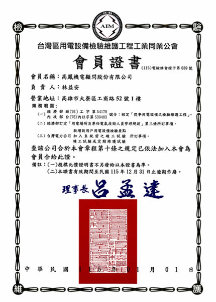 擁有各項專業證照:電機技師、空調技師、廢棄物、空氣污染、廢水處理、毒性物質、勞安管理員、技術人員執照、用電設備檢驗證照、紅外線熱顯影檢測證書..等證照。